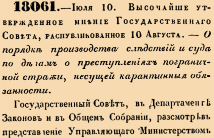18061. 1844 год. 10 июля (22 июля). Высочайше утвержденное мнение Государственнаго Совета, распубликованное 10 Августа. О порядке производства следствий и суда по делам о преступлениях пограничной стражи, несущей карантинныя обязанности