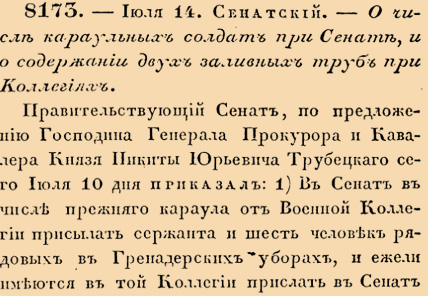 8173. 1740 год. 25 июля (14 июля ст.ст.) Сенатский. О числе караульных солдат при Сенате, и о содержании двух заливных труб при Коллегиях.Правительствующий Сенат, по предложению Господина Генерала Прокурора и Кавалера Князя Никиты Юрьевича Трубецкаго сего Июля 10 дня приказал: 1) В Сенат в числе прежняго караула от Военной Коллегии присылать сержанта и шесть человек рядовых в Гренадерских уборах, и ежели имеются в той Коллегии прислать в Сенат два протазана <…>
