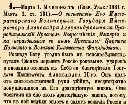 Закон № 1. - 1881 год 13 марта (1 марта). Манифест о восшествии на престол Императора Александра III после убийства его отца, Императора Александра II.