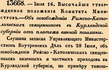 13668. 1840 год. 28 июля (16 июля ст.ст.) Высочайше утвержденное положение Комитета Министров. Об освобождении Римско-Католических священников в Курляндской губернии от платежа винной пошлины.Слушана записка Управляющаго Министерством Внутренних Дел от 28 Июня, об освобождении Римско-Католических священников казенных и частных приходов в Курляндской губернии, по примеру тамошних Евангелическо-Лютеранских проповедников, от платежа винной пошлины, с воспрещением им заниматься винокурением и продажею пива <…>