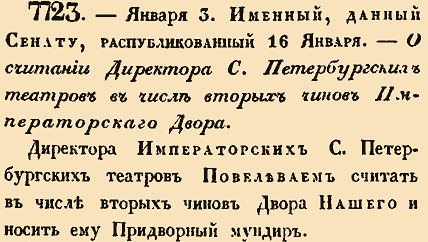 7723. — Января 3. Именный, данный Сенату. 16 Января 1835 года.О считании Директора С. Петербургскихтеатров в числе вторых чинов Императорского ДвораДиректора Императорских С. Петербургских театров Повелеваем считать в числе вторых чинов двора Нашего и носить ему Придворный мундир.