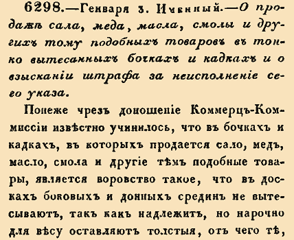 6298. — Января 3 (14 Января по н.ст.) Именный. 1733 год. О продаже сала, меда, масла, смолы и других тому подобных товаров в тонко вытесанных бочках и кадках и о взыскании штрафа за неисполнение сего указа Понеже чрез донесение Коммерц-Комиссии известно учинилось, что в бочках и кадках, в которых продается сало, мед, масло, смола и другие тем подобные товары, является воровство такое, что в досках бочковых и донных средин не вытесывают, так как надлежит, но нарочно для весу оставляют толстые, от чего те, которые купят, несут убытки, ибо когда купить и надеется быть вывесу той бочки или кадки дерева обыкновенну, а потом, как станет товар выпоразживать, явится фальшивая кадка или бочка толстая, вместо купленного товара, дерево<...>