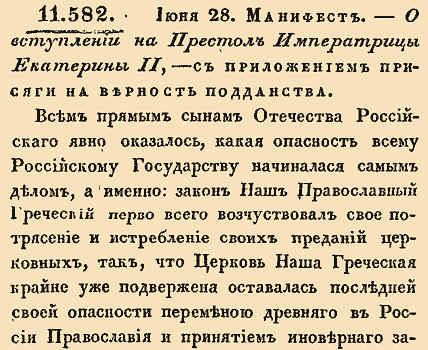 11582. — Июня 28 (9 июля по н.ст.) Манифест. 1762 год.О вступлении на Престол Императрицы Екатерины II Всем прямым сынам Отечества Российского явно оказалось, какая опасность всему Российскому Государству начиналася самым делом, а именно: закон Наш Православный Греческий перво всего восчуствовал свое потрясение и истребление своих преданий церковных, так, что Церковь Наша Греческая крайне уже подвержена оставалась последней своей опасности переменою в России Православия и принятием иноверного закона. Второе, слава Российская, возведенная на высокую степень своим победоносным оружием, чрез многое свое кровопролитие, заключением нового мира самим её злодеям отдана уже действительно в совершенное порабощение; а между тем внутренние порядки, составляющие целость всего Нашего Отечества со всем испровержены. Того ради, убеждены будучи всех Наших верноподданных таковою опасностью, принуждены были приняв Бога и Его правосудие Себе в помощь, а особливо видев к тому желание всех Наших ве