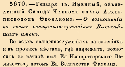 5670. — Января 13. Именный, объявленный Синоду Членом онаго Архиепископом Феофаном, 1731 год.О возношении во всех священнослужениях Высочайших именВо всех священнослужениях на эктениях и в прочих местах, где надлежит, возносить в начале имя Ея Императорского Величества, потом Ея Величества Фамилию.