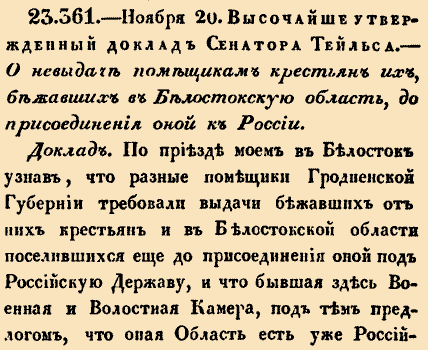 23.361 — Ноября 20. Высочайше утвержденный доклад Сенатора Тейльса, 1808 год.О невыдаче помещикам крестьян их, бежавших в Белостокскую область, до присоединения оной к РоссииДоклад. По приезде моем в Белосток узнав, что разные помещики Гродненской Губернии требовали выдачи бежавших от них крестьян и в Белостокской области поселившихся ещё до присоединения оной под Российскую Державу, и что бывшая здесь Военная и Волостная Камера, под тем предлогом, что оная Область есть уже Российская, давая некоторым позволение о отыскании таковых бежавших, почел я возвращение сих людей прежним их владельцам неправильным; а потому ещё в прошлом году отнесся к Начальнику Гродненской Губернии, чтоб тамошним помещикам воспретить приезжать.