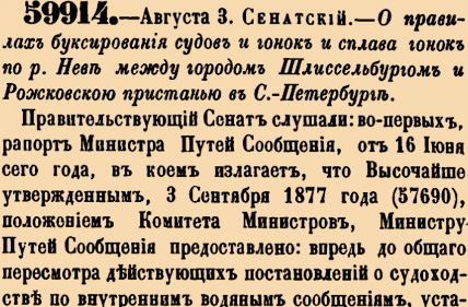 59914. 1879 год. 15 августа (3 августа ст.ст.) Сенатский. О правилах буксирования судов и гонок и сплава гонок по р.Неве между городом Шлиссельбургом и Рожовскою пристанью в С.-Петербурге. <…> впредь до общаго пересмотра действующих постановлений о судоходстве по внутренним водяным сообщениям, установлять обязательныя к исполнению правила о порядке и условиях следования cудов по означенным сообщениям, разстановки их в местах стоянок и пропуска через искуственныя сооружения <…>