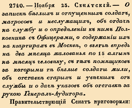 2740. — 4 декабря (23 ноября по ст.ст.). Сенатский, 1713 год.О записке беглых и отпущенных солдат, матросов и неслужащих, об отдаче на службу и о определении к ним Полковника с Офицерами, о содержании их на квартирах в Москве, о взятии впредь на два месяца жалования по 15 алтын на месяц каждому и др.Правительствующий Сенат приговорили: о записке беглых и отпущенных драгун и солдат и матросов и неслужащих чинить по прежнему Великого Государя указу и приговору Октября 28 дня неотменно, и записывая отдавать в службу годных в особливый полк, и для того определить Полковника с Офицеры и держать их на квартерах в Москве под смотрением так как содержатся гарнизонные полки, и учить военному артиклу