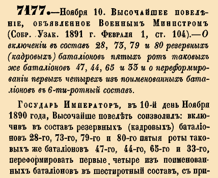 7177. — 22 Ноября (10 Ноября ст.ст.). Высочайшее повеление, объявленное Военным Министром, 1890 г.О включении в состав 28, 75, 79 × 80 резервных (кадровых) батальонов пятых рот таковых же батальонов 47, 44, 65 × 33 и о нереформировании первых четырех из поименованных батальонов в 6-ти ротный составГосударь Император, в 10-й день Ноября 1890 года, Высочайше повелеть соизволил: включив в состав резервных (кадровых) батальонов 28-го, 75-го, 79-го и 80-го пятых рот таковых же батальонов 47-го, 44-го, 65-го и 33-го, переформировать первые четыре из поименованных батальонов в шестиротный состав, с присвоением им нижеследующего временного штата