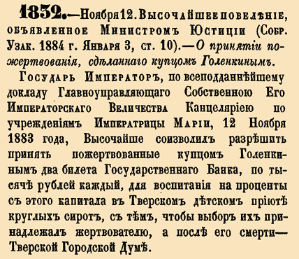 1832. — 24 ноября (12 ноября по ст.ст.). Высочайшее повеление, объявленное Министром Юстиции, 1883 г.О принятии пожертвования, сделанного купцом ГоленкинымГосударь Император, по всеподданнейшему докладу Главноуправляющего Собственною Его Императорского Величества Канцеляриею по учреждениям Императрицы Марии, 12 Ноября 1883 года, Высочайше соизволил разрешить принять пожертвованные купцом Голенкиным два билета Государственного Банка, по тысяче рублей каждый, для воспитания на проценты с этого капитала в Тверском детском приюте круглых сирот, с тем, чтобы выбор их принадлежал жертвователю, а после его смерти — Тверской Городской Думе.