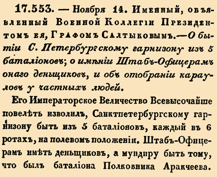 17.553. — 25 ноября (14 ноября по ст.ст.). Именный, объявленный Военной Коллегии Президентом ее, Графом Салтыковым, 1796 г.О бытии С.Петербургскому гарнизону из 5 батальонов; о имении Штаб-Офицерам оного денщиков, и об отобрании караулов у частных людейЕго Императорское Величество Всевысочайше повелеть изволил, Санктпетербургскому гарнизону быть из 5 батальонов, каждый в 6 ротах, на полевом положении. Штаб-Офицерам иметь деньщиков, а мундиру быть тому, что был батальона Полковника Аракчеева. Караулы гарнизонные, находящиеся у партикулярных людей, отобрать немедленно