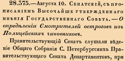 28375. 1820 год. 10 августа (22 августа). Сенатский, с прописанием Высочайше утвержденнаго мнения Государственнаго Совета. О определении Смотрителей острогов из Полицейских чиновников.