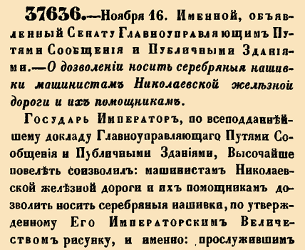 37636. 1861 год. 16 ноября (28 ноября). Именной, объявленный Сенату Главноуправляющим Путями Сообщения и Публичными Зданиями, 1861 г. О дозволении носить серебрянные нашивки машинистам Николаевской железной дороги и их помощников