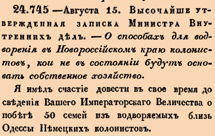 24745. 1811 год. 27 августа (15 августа ст.ст.) Высочайше утвержденная записка Министра Внутренних дел. О способах для водворения в Новороссийском краю колонистов, кои не в состоянии будут основать собственное хозяйство. Я имел счастие донести в свое время до сведения Вашего Императорскаго Величества о побеге 50 семей из водворяемых близ Одессы Немецких колонистов <…>