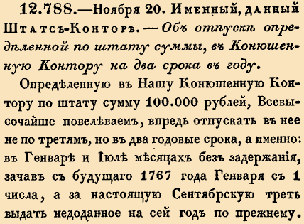 12.788. — 1 декабря (20 ноября по ст.ст.). Именный, данный Штатс-Конторе, 1766 г.Об отпуске определенной по штату суммы, в Конюшенную Контору на два срока в году Определенную в Нашу Конюшенную Контору по штату сумму 100.000 рублей, Всевысочайше повелеваем, впредь отпускать в нее не по третям, но по два годовых срока, а именно: в Январе и Июле месяцах без задержания, зачав с будущего 1767 годя Января с 1 числа, а за настоящую Сентябрьскую треть выдать недоданное на сей год по прежнему.