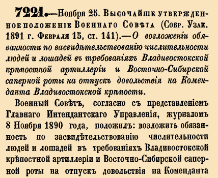7221. — 7 декабря (25 ноября по ст.ст.). Высочайше утвержденное положение Военного совета, 1890 год.О возложении обязанности по засвидетельствованию численности людей и лошадей в требованиях Владивостокской крепостной артиллерии и Восточно-Сибирской саперной роты на отпуск довольствия на Коменданта Владивостокской крепости.Военный Совет, согласно с представлением Главного Интендантского Управления, журналом 8 ноября 1890 года, положил: возложить обязанность по засвидетельствованию численности людей и лошадей в требованиях Владивостокской крепостной артиллерии и Восточно-Сибирской саперной роты на отпуск довольствия на Коменданта Владивостокской крепости, который, по управлению войсками крепости, на основании Высочайше утвержденного, 8 июня 1890 года, положения Военного Совета, пользуется правами Начальника дивизии.Положение это Высочайше утверждено 25 Ноября 1890 года.