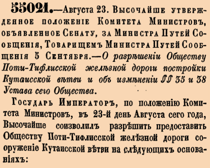 55021. 1875 год. 4 сентября (23 августа ст.ст.) Высочайше утвержденное положение Комитета Министров, объявленное Сенату, за Министра Путей Сообщения, Товарищем Министра Путей Сообщения 5 Сентября.О разрешении Обществу Поти-Тифлисской железной дороги постройки Кутаисской ветви и об изменении §§35 и 38 Устава сего Общества