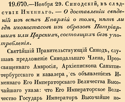 19.670. — 11 декабря (29 ноября по ст.ст.). Синодский, в следствие Именного, 1800 год.О доставлении сведений из всех Епархий о том, нет ли где иконостасов из образов Патриарших или Царских, состоящих без употребления.Святейший Правительствующий Синод, слушав предложение синодального Члена, Преосвященного Амвросия, Архиепископа Санктпетербургского и кавалера, с объявлением Именного Его Императорского Величества высочайшего указа: что Его Императорское Величество Государь Император Высочайше повелеть соизволил, чтобы узнать, нет ли где в монастырях или церквах иконостасов из образов Патриарших или Царских состоящих, без употребления? и если найдутся, то доставить описание их, с изъяснением их, если можно, лет, когда образа сии были писаны.