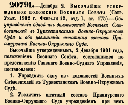 20791. — 15 декабря (2 декабря по ст.ст.). Высочайше утвержденное положение Военного Совета, 1901 год.Об упразднении одной из должностей Военных Следователей в Туркестанском Военно-Окружном Суде и об увеличении штатного состава Приамурского Военно-Окружного Суда.Высочайше утвержденным, 2 декабря 1901 года, положением Военного Совета, состоявшимся по представлению Главного Военно-Судного Управления, постановлено:1. Упразднить одну из должностей Военных Следователей в Туркестанском военно-Окружном Суде.2. Увеличить штатный состав Приамурского Военно-Окружного Суда учреждением при нем одной новой должности Военного Следователя, с содержанием и правами, присвоенными таковыми должностям по штату сего Суда. 3. Увеличить суммы, отпускаемые Приамурскому Военно-Окружному Суду и прокурорскому при нем надзору, по пятидесяти рублей каждому ежегодно, на канцелярские расходы.