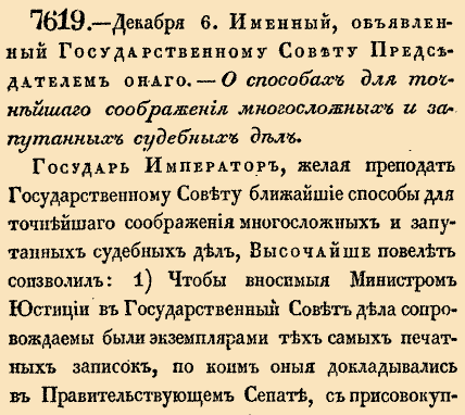Закон № 7619. 1834 год. 6 декабря (18 декабря). Указ о предоставлении членам Госсовета печатных материалов Сената по сложным делам и об обязательном присутствии министров на всех заседаниях.