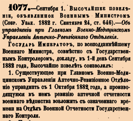 1077. 1882 год. 1 сентября (13 сентября). Высочайшее повеление, объявленное Военным Министром. Об упразднении при Главном Военно-Медицинском Управлении Аптечно-Ревизионнаго Отделения.