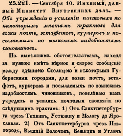 25221. 1812 год. 22 сентября (10 сентября ст.ст.) Именный, данный Министру Внутренних дел. Об учреждении и усилении почтовых по некоторым местам трактов для возки почт, эстафетов, курьеров и посылаемых по воинским надобностям чиновников.По нынешним обстоятельствам, находя за нужное иметь верное и скорое сообщение между здешнею Столицею и некоторыми Губернскими городами, для возки почт, эстафет, курьеров и посылаемых по воинским надобностям чиновников, повелеваю вам учредить и усилить почтовыя сношения по следующим трактам <...>
