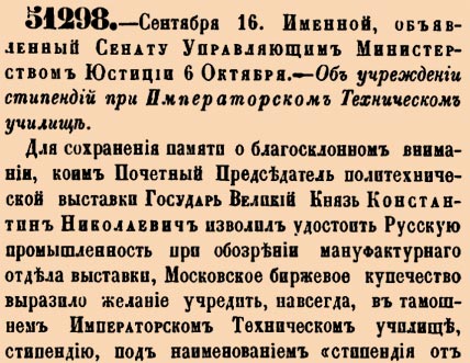 51298. 1872 год. 28 сентября (16 сентября ст.ст.) Именной, объявленный Сенату Управляющим Министерством Юстиции 6 Октября. Об учреждении стипендий при Императорском Техническом училище. Для сохранения памяти о благосклонном внимании, коим Почетный Председатель политехнической выставки Государь Великий Князь Константин Николаевич изволил удостоить Русскую промышленность при обозрении мануфактурнаго отдела выставки, Московское биржевое купечество выразило желание учредить, навсегда, в тамошнем Императорском Техническом училище, стипендию<…>
