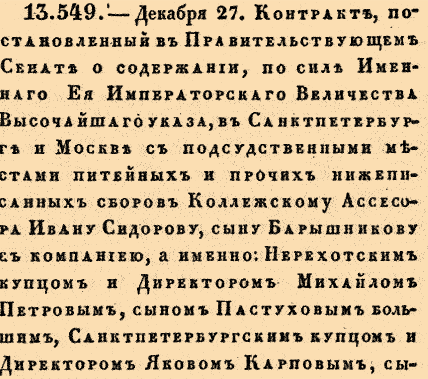 13549. 1770 год. 7 января (27 декабря ст.ст.)Контракт, постановленный в Правительствующем Сенате о содержании...Контракт, постановленный в Правительствующем Сенате о содержании, по силе Именнаго Ея Императорскаго Величества Высочайшаго указа, в Санктпетербурге и Москве с подсудственными местами питейных и прочих нижеписанных сборов Коллежскому Ассесора Ивану Сидорову, сыну Барышникову с компаниею, а именно: Нерехотским купцом и Директором Михайлом Петровым, сыном Пастуховым большим, Санктпетербургским купцом и Директором Яковым Карповым, сыном Апайщиковым и Санктпетербургскими же купцами Трифоном Яковлевым, сыном Поздняковым, и Михайлом Федоровым сыном Пчолкиным, с будущаго 1771 впредь через четыре года, то есть по 1775 год, на нижеследующих кондициях (…)