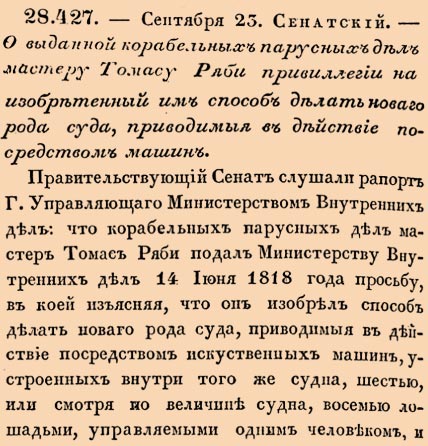 О выданной корабельных парусных дел мастеру Томасу Ряби привилегии на изобретенный им способ делать новаго рода суда, приводимыя в действие посредством машин.