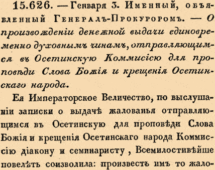 15626. 3 января (14 января). Именный, объявленный Генерал-Прокурором. О произвождении денежной выдачи единовременно духовным чинам, отправляющимся в Осетинскую Коммиссию для проповеди Слова Божия и крещения