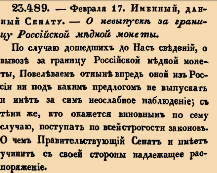 23489. 1809 год. 1 марта (17 февраля ст.ст.) Именный, данный Сенату. О невыпуске за границу Российской медной монеты. По случаю дошедших до Нас сведений, о вывозе за границу Российской медной монеты, Повелеваем отныне впредь оной из России ни под каким предлогом не выпускать и иметь за сим неослабное наблюдение; с теми же, кто окажется виновным по сему случаю, поступать по всей строгости законов. О чем Правительствующий Сенат и имеет учинить с своей стороны надлежащее распоряжение.
