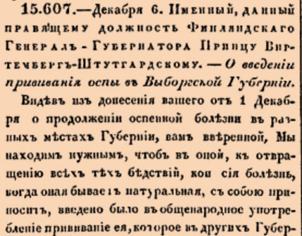 15607. 1782 год. 17 декабря (6 декабря ст.ст.) Именный, данный правящему должность Финляндскаго Генерал-Губернатора Принцу Виртемберг-Штутгардскому. О введении прививания оспы в Выборгской Губернии.Видев из донесения вашего от 1 Декабря о продолжении оспенной болезни в разных местах Губернии, вам вверенной, Мы находим нужным, чтоб в оной, к отвращению всех тех бедствий, кои сия болезнь, когда она бывает натуральная, с собою приносит, введено было в общенародное употребление прививание ея