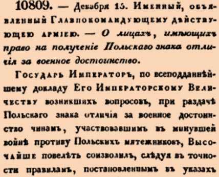 10809. 1837 год. 27 декабря (15 декабря ст.ст.) Именный, объявленный Главнокомандующему действующею армиею. О лицах, имеющих право на получение Польскаго знака отличия за военное достоинство.<…> 1) Строевым генералам, штаб и обер-офицерам и нижним чинам, кои по разным случаям не быв в сражениях противу неприятеля, находились во время войны при войсках действующей армии, для исполнения других обязанностей <…>