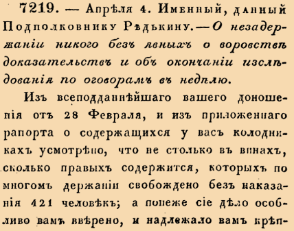 7219. 1737 год. 15 апреля (4 апреля ст.ст.). Именный, данный Подполковнику Редькину О незадержании никого без явных о воровстве доказательств и об окончании изследования по оговорам в неделю.Из всеподданейшаго вашего доношения от 28 Февраля, и из приложеннаго рапорта о содержащихся у вас колодниках усмотрено, что не столько в винах, сколько правых содержится, которых по многом держании свобождено без наказания 421 человек; а понеже сие дело особливо вам вверено, и надлежало вам крепкое смотрение иметь, чтобы ни один человек безвинно задержан и разорен не был, ибо от долговременнаго, безвиннаго держания сами погибают и домы их разоряются <…>