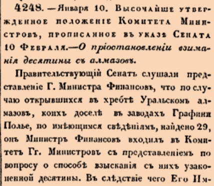 4248. 1831 год. 22 января (10 января ст.ст.) Высочайше утвержденное положение Комитета Министров, прописанное в указе Сената 10 Февраля. О приостановлении взимания десятины с алмазов.Правительствующий Сенат слушали представление Г.Министра Финансов, что по случаю открывшихся в хребте Уральском алмазов, коих доселе в заводах Графини Полье, по имеющимся сведениям, найдено 29, он Министр Финансов входил в Комитет Гг. Министров с представлением по вопросу о способе взыскания с них узаконенной десятины