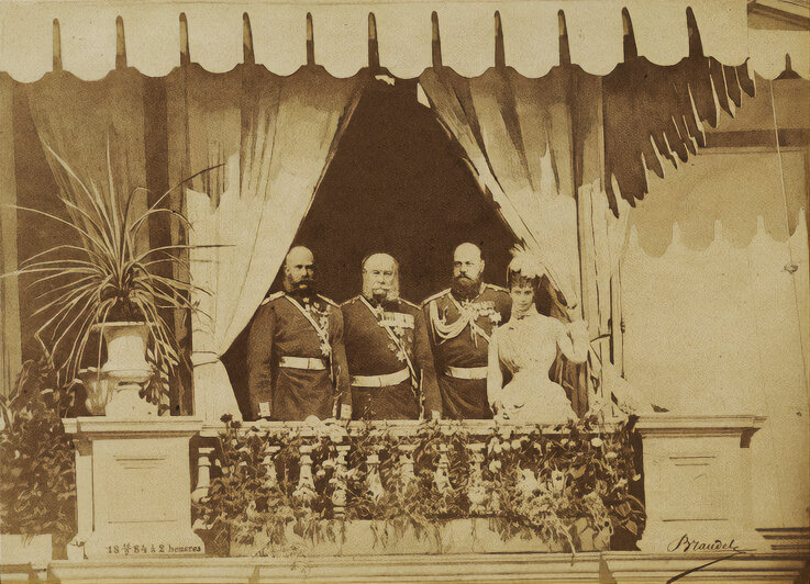Австрийский император Франц-Иосиф, германский император Вильгельм I, российский император Александр III и императрица Мария Федоровна во время встречи 17 сентября 1884 г. в Скерневцах