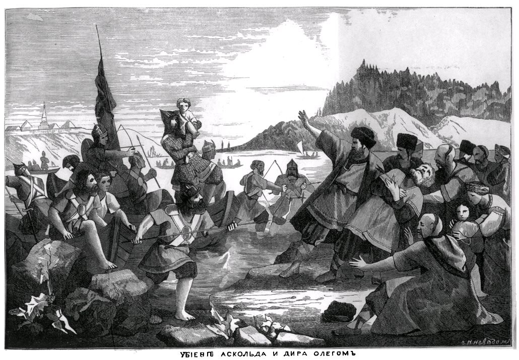 Наконец, Олег достиг Киева, где княжили Аскольд и Дир; здесь, по преданию, он оставил большую часть своих лодок назади, скрыл ратных людей на тех лодках, на которых подплыл к Киеву, и послал сказать Аскольду и Диру, что земляки их, купцы, идущие в Грецию от Олега и княжича Игоря, хотят повидаться с ними. Аскольд и Дир пришли, но тотчас же были окружены ратными людьми, повыскакавшими из лодок; Олег будто бы сказал киевским князьям: "Вы не князья, ни роду княжеского, а я роду княжеского" и, указывая на вынесенного в это время Игоря, прибавил: "Вот сын Рюриков". Аскольд и Дир были убиты и погребены на горе…