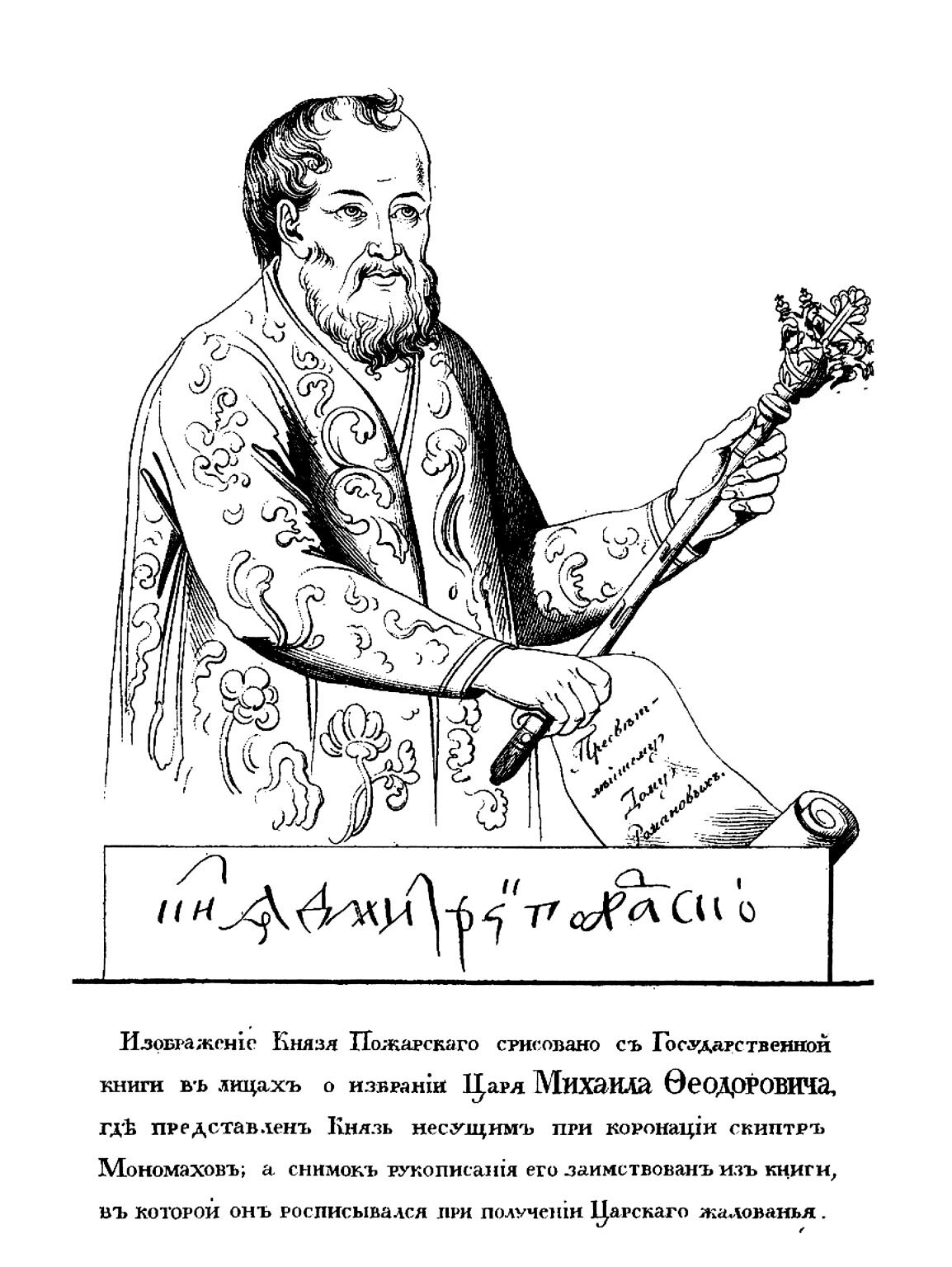 «Изображение Князя Пожарского срисовано с Государственной книги в лицах о избрании Царя Михаила Федоровича, где представлен Князь несущим при коронации скипетр Мономахов; а снимок рукописания его заимствован из книги, в которой он расписывался при получении Царского жалованья». ";s:4:"TYPE";s:4:"html";}