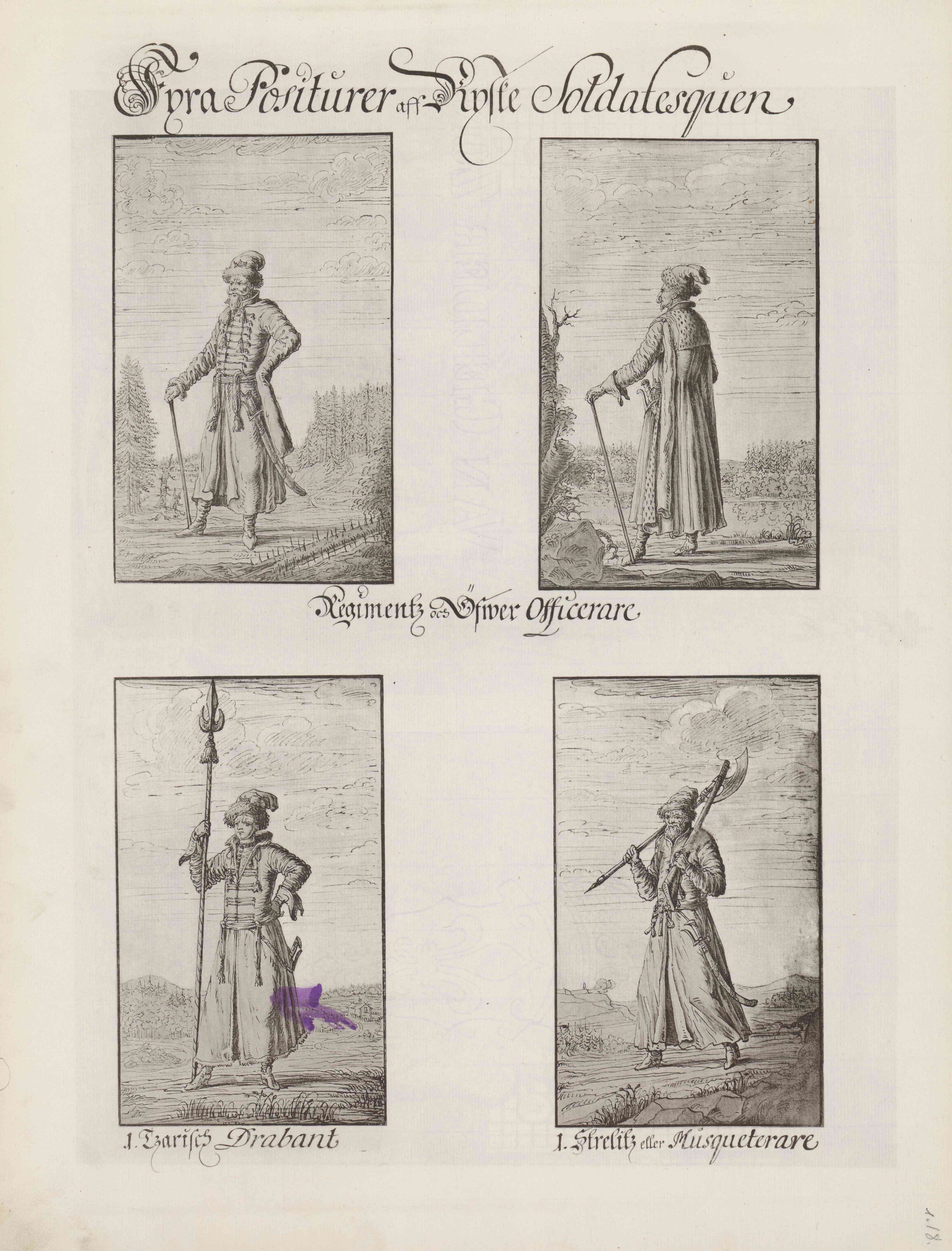 Четыре изображения русских военных. Полковые и старшие офицеры: Один из царских драбантов. Стрелец или мушкетер.