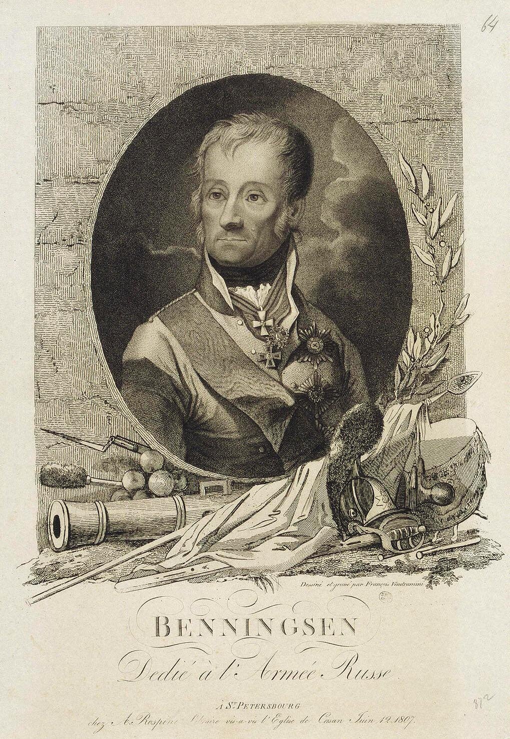 [ Levin August Gottlieb Theophil von Bennigsen ], генерал от кавалерии (1745 - 1826), происходил из древней ганноверской фамилии; службу начал в ганноверской пехоте, а в 1773 г. принят премьер-майором в Вятский мушкетерский полк; в 1774 г. сражался в армии Румянцева ; в 1787 г. назначен командиром Изюмского легкоконного полка, с которым участвовал в кампаниях 1789 и 1790 годов и отличился под Очаковом и при взятии Бендер. В 1792 г. принимал участие в делах против конфедератов. В 1794 г. Беннигсен разбил поляков при Солами и, переправившись вплавь через Неман, нанес им поражение у Олиты. Затем Беннигсен участвовал в войне с Персией и отличился при взятии Дербента. В 1802 г. произведен в генералы от кавалерии. В кампании 1806 г. Беннигсен нанес поражение французам под Пултуском, заслужив орден св. Георгия 2-й степени; в 1807 г., будучи главнокомандующим вместо графа Каменского , в сражении при Прейсиш-Эйлау сдержал напор французской армии, предводимой Наполеоном (орден св. Андрея Первозванного и 12 000 руб. пенсии), затем разбил Нея у Гутштадта, отразил Наполеона у Гейльсберга, но сам был разбит под Фридландом. В начале Отечественной войны Беннигсен состоял при императоре Александре , потом был начальником главного штаба армии, участвовал в бородинском и тарутинском сражениях, после чего удалился в свои поместья, награжденный орденом св. Владимира 1-й степени, алмазными знаками к ордену св. Андрея и 200 000 руб. В 1813 г., будучи главнокомандующим польской армией, Беннигсен разбил Сен-Сира при Доне и за отличие в лейпцигской битве возведен в графское достоинство; после этого он постепенно обложил Торгау, Виттенберг, Магдебург и Гамбург. По заключении Парижского мира награжден орденом св. Георгия 1-й степени; по возвращении в Россию до 1818 г. был главнокомандующим 2-й армией, после чего испросил увольнение от должности и переехал в Ганновер.