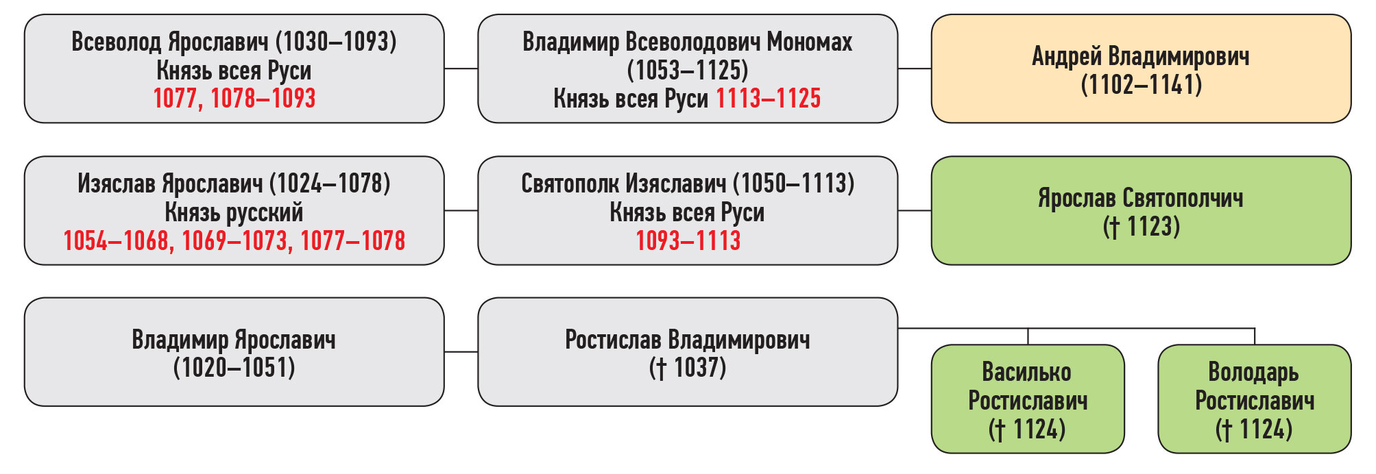 Ярослав Святополчич — сын Святополка Изяславича, Андрей Владимирович — сын Владимира Мономаха, Володарь, Василько Ростиславичи — дети Ростислава Владимировича, внука Ярослава