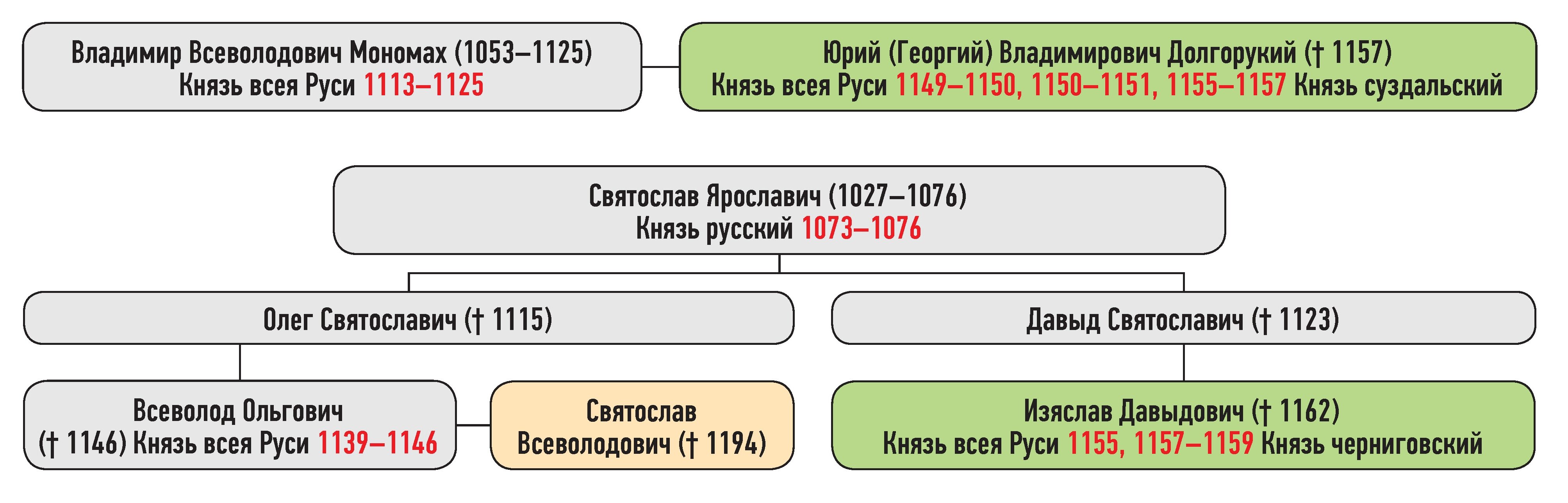 Юрий Владимирович — сын Владимира Всеволодовича Мономаха, Изяслав Давыдович — сын Давыда Святославича, Святослав Всеволодович — сын Всеволода Ольговича