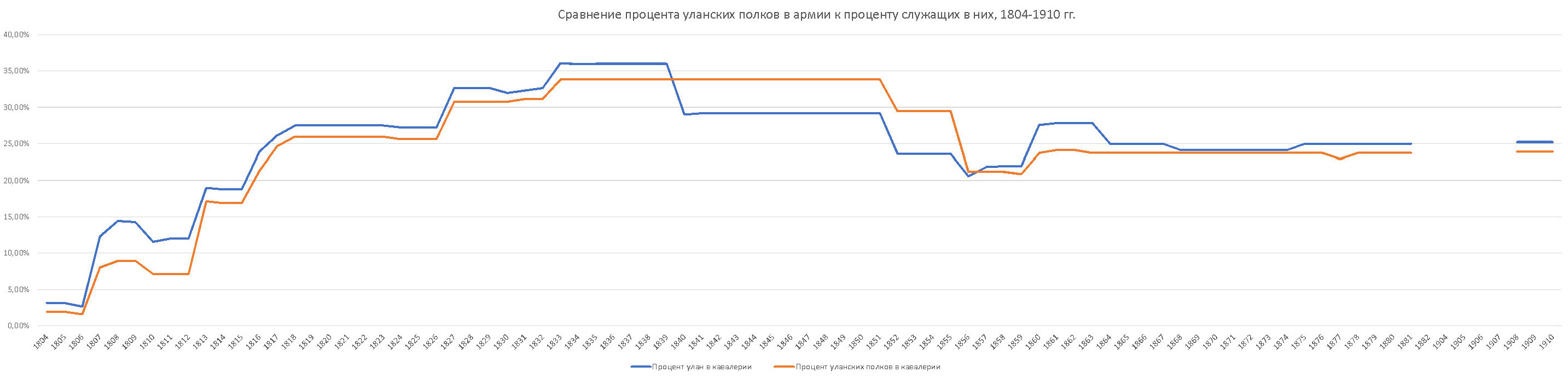 Сравнение процента уланских полков в армии к проценту служащих в них русской армии