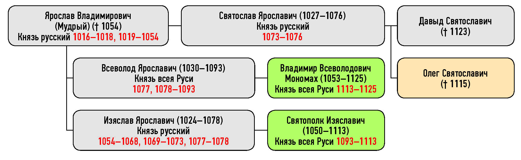 Ярослав Владимирович (Мудрый) († 1054), Изяслав Ярославич (1024–1078) Князь русский, Всеволод Ярославич (1030–1093) Князь всея Руси, Святослав Ярославич (1027–1076) Князь русский, Владимир Всеволодович Мономах (1053–1125), Святополк Изяславич (1050–1113), Давыд Святославич († 1123), Олег Святославич († 1115)