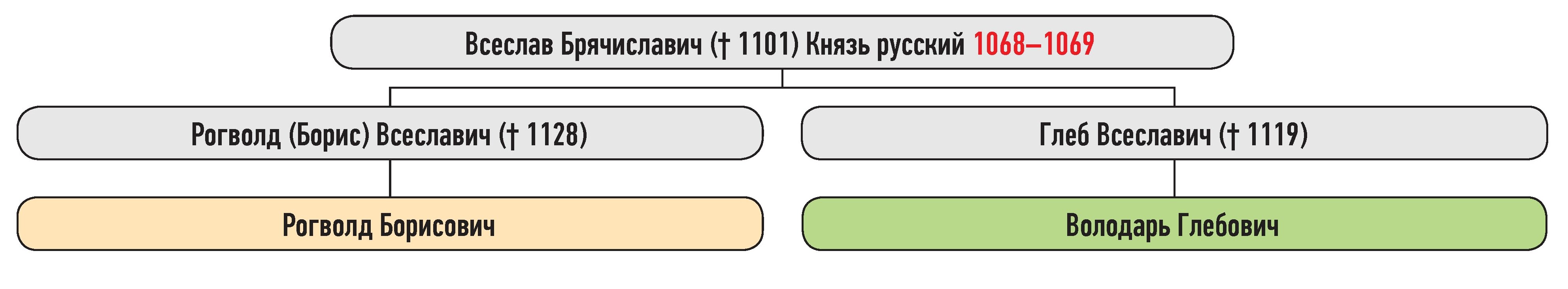 Оригинальная схема, создана для описания усобицы Рогволда Борисовича и Володаря Глебовича в 1162 г.