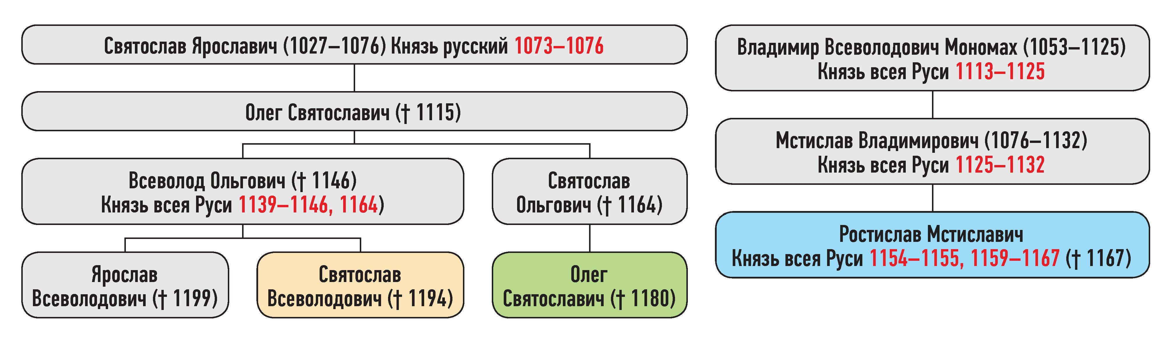 Святослав Всеволодович — сын Всеволода Ольговича, Ярослав Святославич — сын Святослава Всеволодовича, Олег Святославич — сын Святослава Ольговича, Ростислав Мстиславич — сын Мстислава Владимировича