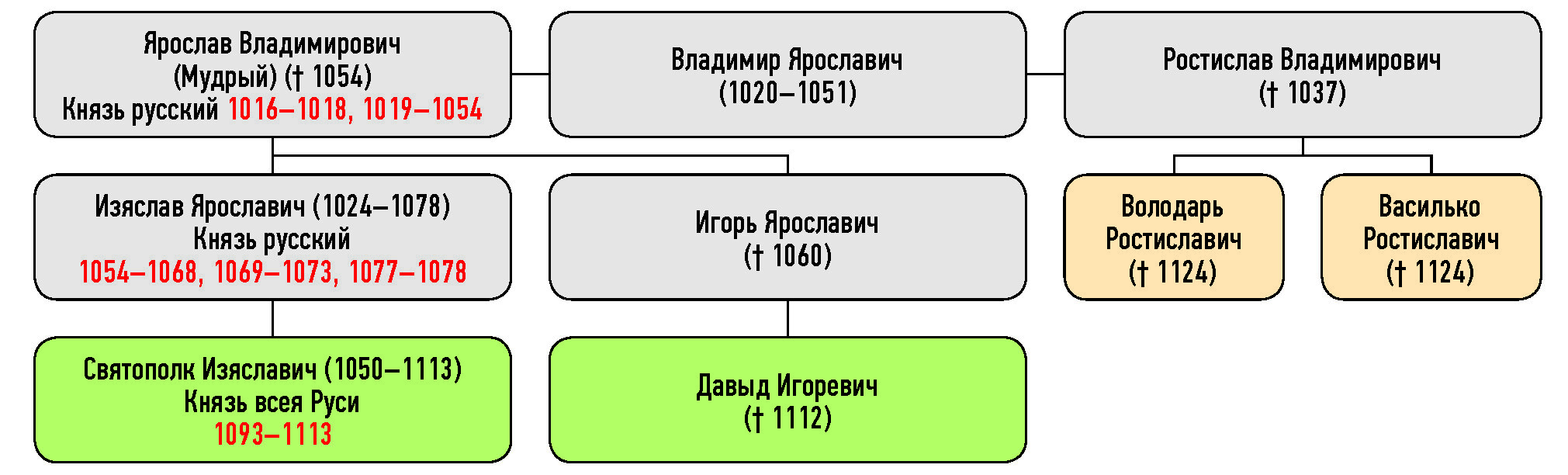 Ярослав Владимирович (Мудрый) († 1054), Владимир Ярославич (1020–1051), Ростислав Владимирович († 1037), Изяслав Ярославич (1024–1078) Князь русский, Игорь Ярославич († 1060), Святополк Изяславич (1050–1113) Князь всея Руси, Давыд Игоревич († 1112), Володарь Ростиславич († 1124), Василько Ростиславич († 1124)