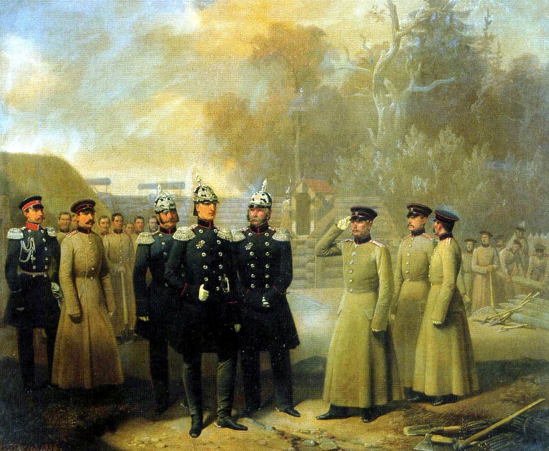 слева - командир лейб-гвардии Саперной бригады генерал-майор Н.Ф. Хомутов 2-й. Командир роты рапортует о ходе выполнения поставленной задачи.