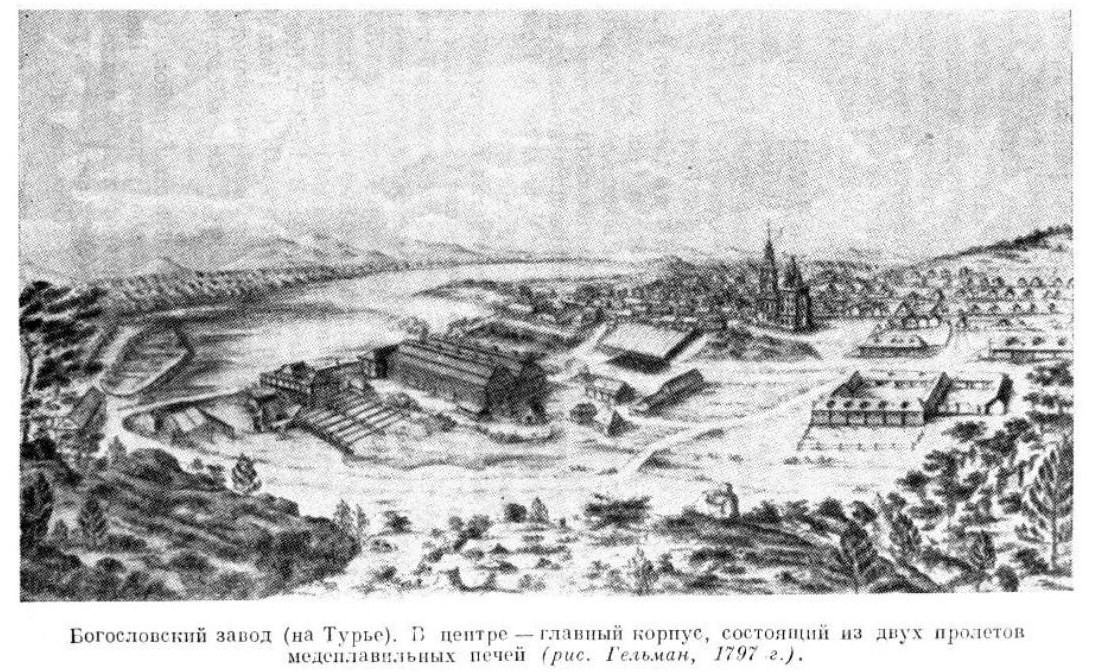 Богословский завод на (Турье).. В центре - главный корпус, состоящий из двух пролетов медеплавильных печей (рис. Гельман, 1797 г.).