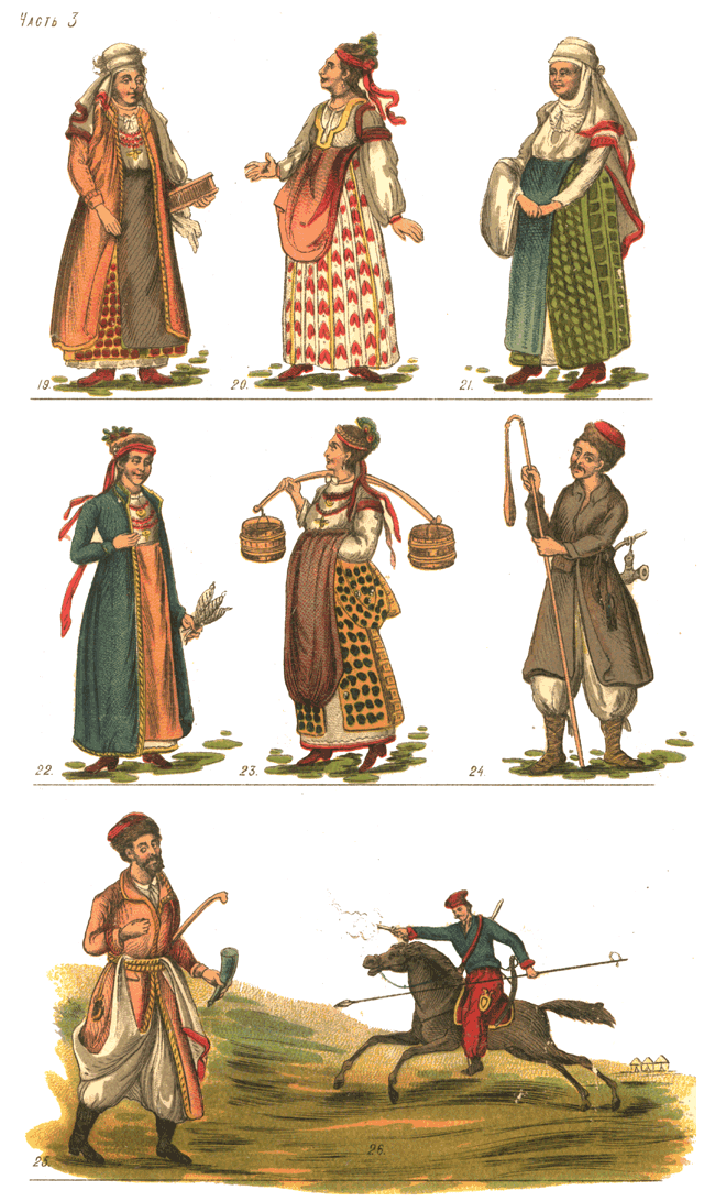 Изображение малороссиян в старинных одеждах: 19) крестьянка в свите; 20) мещанская девушка; 21) крестьянка в одной плахте и запаске; 22) сельская девушка в свите; 23) девушка без свиты; 24) литовский крестьянин; 25) малороссийский литовский крестьянин и 2