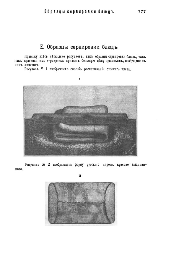 Образцы сервировки блюд. Рисунок №1. Способ раскатывания слоеного теста. Рисунок №2. Форма русского пирога, красиво защипанного.